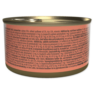 | Složení | Losos 55 %, rafinovaný slunečnicový olej 2 %, rýže 1,5 %, minerály. |