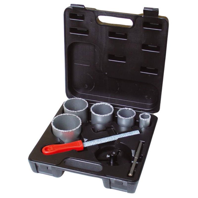 korunka vykružovací - sada 8 kskorunka s karbidovým ostřím pro čisté a přesné vrtáníprůměry korunek: 33; 53; 67; 73; 83 mmuniverzální ALU unašečspeciální vodící vrtákpilníkbaleno v plastovém kufru