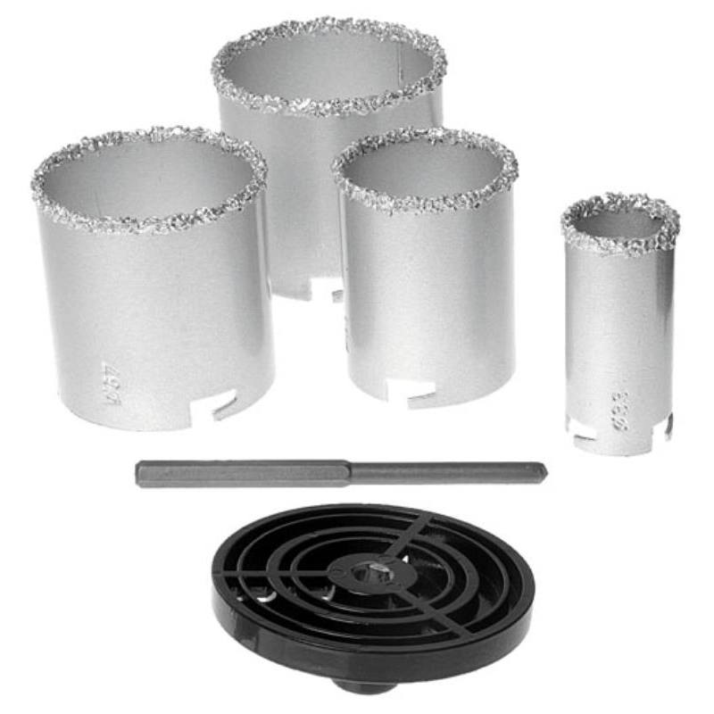 sada vykružovacích korunekkorunka s karbidovým ostřím pro čisté a přesné vrtáníprůměry korunek: 33; 53; 67; 73 mmuniverzální ALU unašečspeciální vodící vrtákv sadě 6 ks