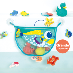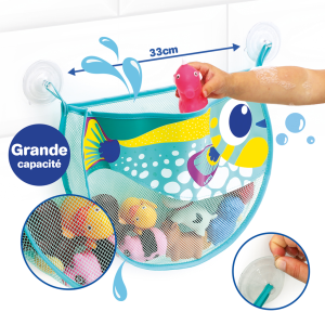 Dotaz na produktOriginální skládací koš na hračky ve veselém designu ryby nabízí chytré řešení, jak mít koupelnu uklizenou hned po koupání. Koš snadno připevníte díky dvěma přísavkám nad vanu. Síťovinové díly umožňují odtok vody z uložených hraček a jejich vyschnutí.