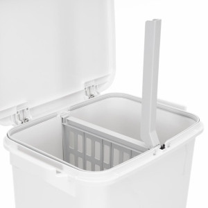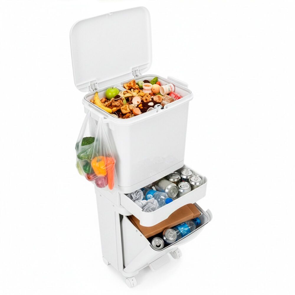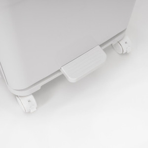 Praktické členění zahrnuje horní přihrádku s víkem, výsuvnou prostřední zásuvku a spodní část ovládanou nožním pedálem, což zajišťuje hygienické a pohodlné používání bez nutnosti dotyku rukou. Horní prostor lze navíc rozdělit na dvě sekce, takže třídění je ještě efektivnější. Velká celková kapacita je ideální i pro větší domácnosti.