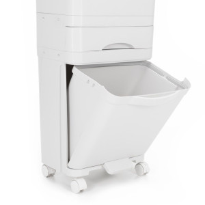 Manipulaci výrazně usnadňují kolečka s aretací, která umožňují snadné přemístění i bezpečné zajištění na místě. Každá přihrádka je vybavena praktickými rukojeťmi pro snadné vyjímání, a součástí balení jsou také samolepky pro přehledné označení odpadu. Tento koš spojuje funkčnost, komfort a přehlednost, díky čemuž je každodenní třídění odpadu jednoduché a systematické.