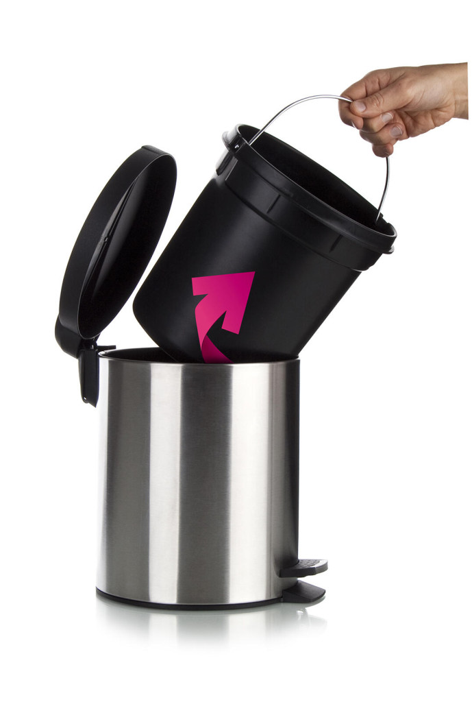 Má matný povrch, plastové víko a vnitřní vyjímatelnou nádobu na odpad.