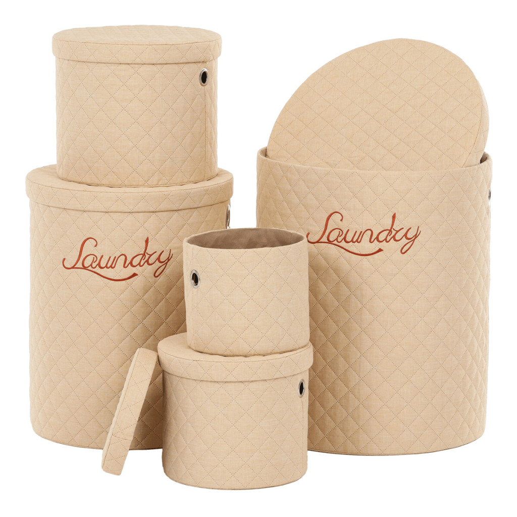 Dotaz na produkt Na splátky ještě dnesSada pěti kulatých prádelních košů o různých velikostech v béžových barvách je ideálním pomocníkem do každé domácnosti. Všechny jsou potaženy hebkou látkou, což zajišťuje nejen elegantní vzhled, ale i příjemný dotek. Tyto koše pomohou v každé domácnosti efektivně uschovat prádlo, a zároveň udržet prostor čistý a uklizený.