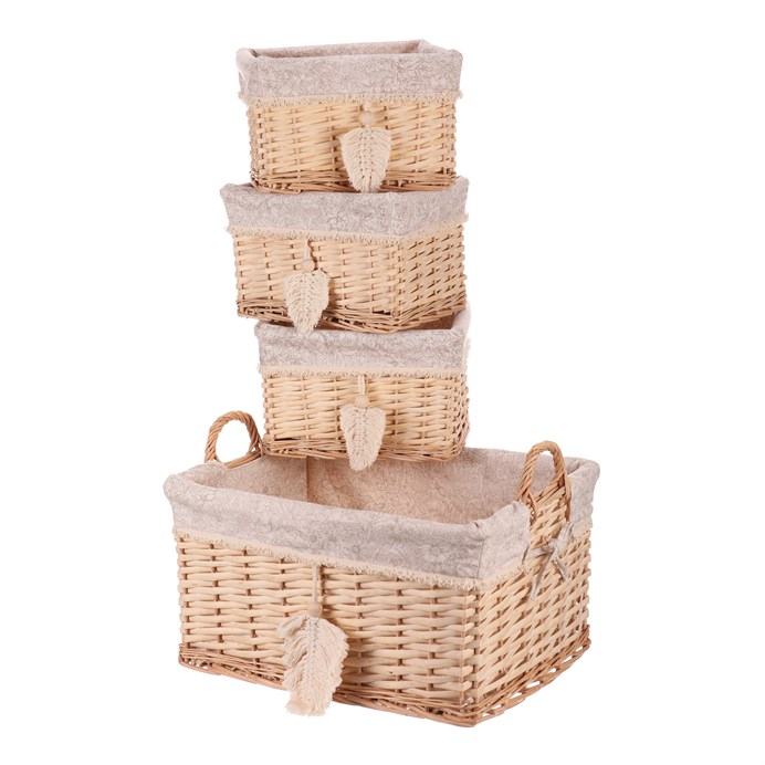 Dotaz na produkt Na splátky ještě dnesSada čtyř hranatých proutěných košů v přírodních barvách o 2 různých velikostech přináší eleganci i praktičnost. Větší kus je pouze jeden, zatímco ty menší jsou zastoupeny rovnou třikrát, což vám umožní efektivně využít každý kout vaší skříně nebo regálu. Všechny koše jsou potažené lehce snímatelnou světle šedou látkou, takže údržba je hračkou. Vytvořte si uklizený a uspořádaný domov snadno a rychle!