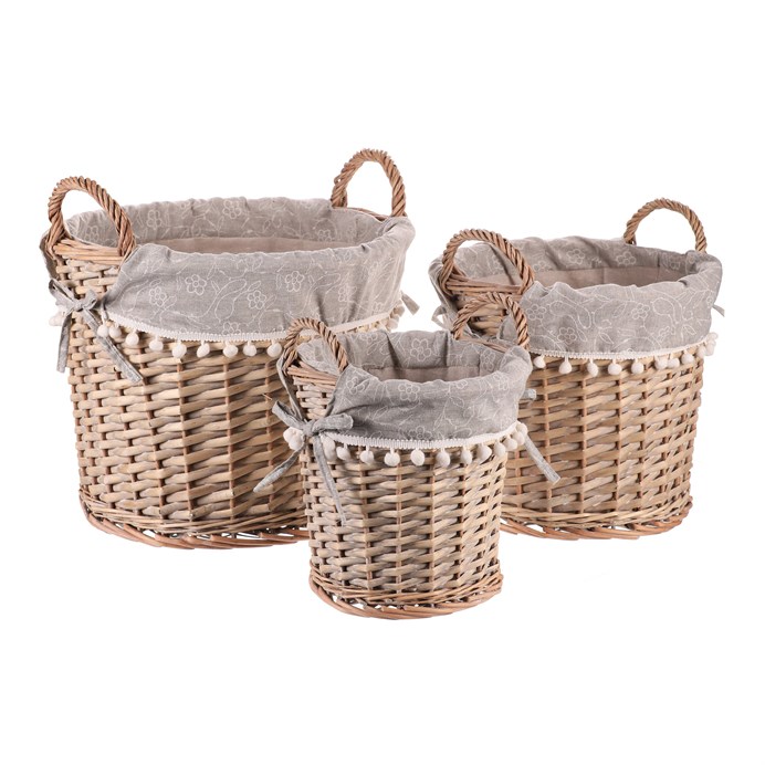 Dotaz na produkt Na splátky ještě dnesSada tří kulatých proutěných košů v přírodní barvě nabízí elegantní řešení pro uspořádané ukládání věcí nebo oblečení. Vhodné jsou zejména do regálů, přičemž každý koš je vyplněn šedou látkou s ozdobnými kulatými třásněmi, které dodávají jemný a stylový vzhled.