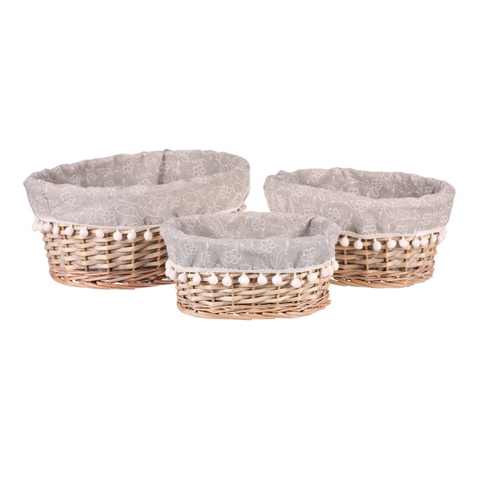 Dotaz na produkt Na splátky ještě dnesSada tří kulatých proutěných košů v přírodní barvě nabízí elegantní řešení pro uspořádané ukládání věcí nebo oblečení. Vhodné jsou zejména do regálů, přičemž každý koš je vyplněn šedou látkou s ozdobnými kulatými třásněmi, které dodávají jemný a stylový vzhled.