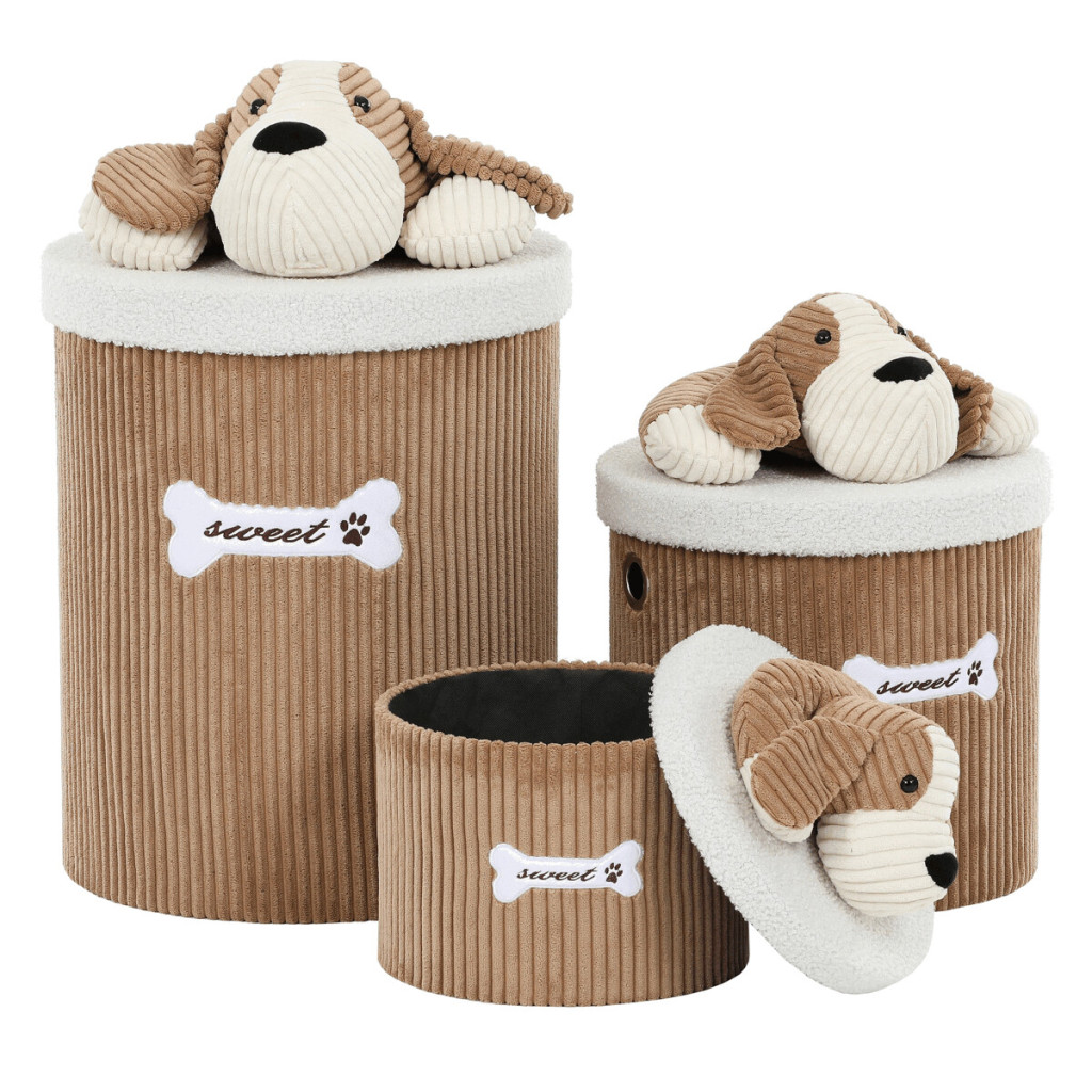 Dotaz na produkt Na splátky ještě dnesSada tří látkových košů v hnědé barvě spojuje praktické využití s hravým designem. Mají měkký manšestrový povrch, kulatý tvar a víko zdobené roztomilým pejskem. Díky různým velikostem je snadno využijete jako regálové i prádelní koše. Ideální pro ukládání prádla, hraček nebo drobností. Zkrátka je to stylový pomocník, který zútulní každý interiér.