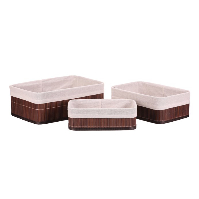 Dotaz na produktSada tří regálových košů v hnědém provedení je vyrobena z bambusu a doplněna o textilní vložku v přírodních odstínech. Koše mají pevné dno a hladký povrch, který usnadňuje údržbu a zároveň přináší přírodní vizuální efekt. Různé velikosti košů umožňují efektivní organizaci prostoru v regálech, skříních nebo na policích. Jsou vhodné pro uložení drobných předmětů, které tak zůstanou přehledně uspořádané a snadno dostupné. Praktické a zároveň dekorativní řešení pro každý interiér.