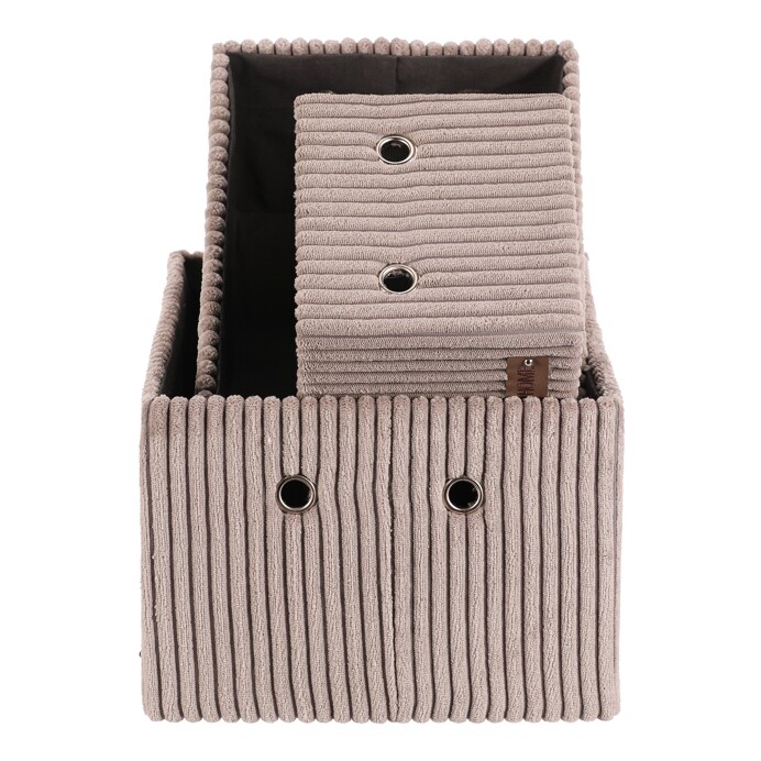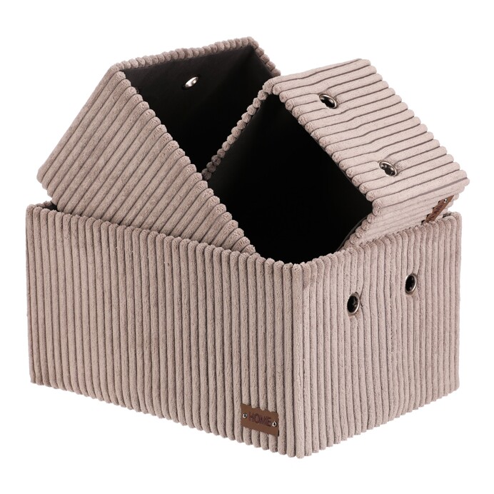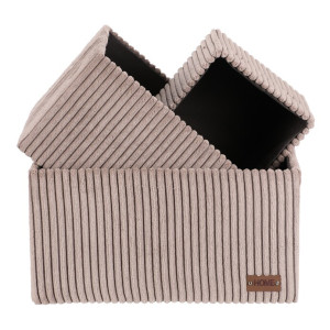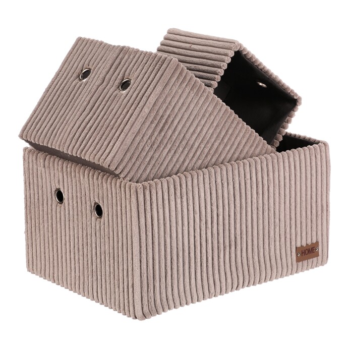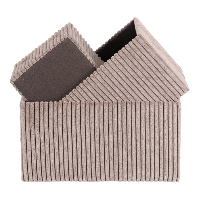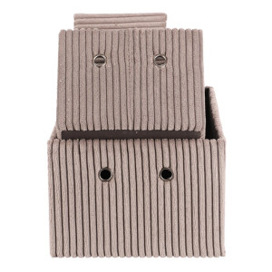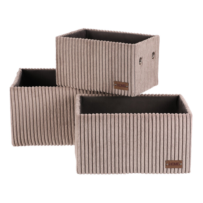 Dotaz na produkt Na splátky ještě dnesSada tří látkových regálových košů o třech různých velikostech s manšestrovým potahem přinese do vaší domácnosti pořádek i styl. Obdélníkový tvar perfektně sedne do polic, povrch je příjemný na dotek a elegantní vzhled skvěle ladí s moderním interiérem. Ideální pro uschování oblečení a nejrůznějších věcí a drobností, které chcete mít přehledně a úhledně uložené.