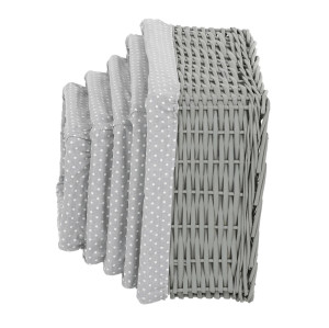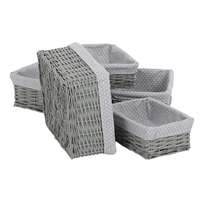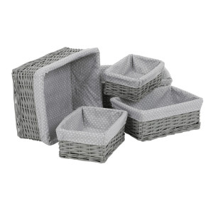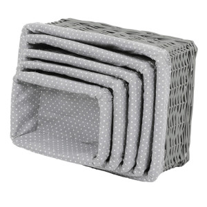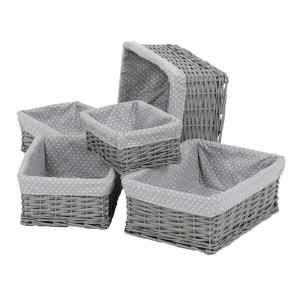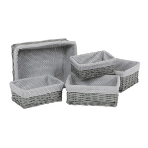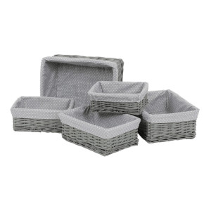Dotaz na produkt Na splátky ještě dnesTento proutěný košík vystlaný látkou je výborným pomocníkem pro milovníky přírodních materiálů, kteří se snaží udržovat pořádek v regálech a na poličkách. Je v neutrální šedé barvě a k dostání v sadě pěti kusů odlišných rozměrů. Díky svému jednoduchému a přirozenému designu se dokonale hodí do různých typů interiérů. Můžete jej využít k uskladnění a uspořádání různých věcí, od knih a hraček po textilie a různé drobnosti konče. Tento košík vám nejen pomůže udržovat nastolený pořádek, ale také přinese do vašeho prostoru příjemný nádech přírodní elegance.