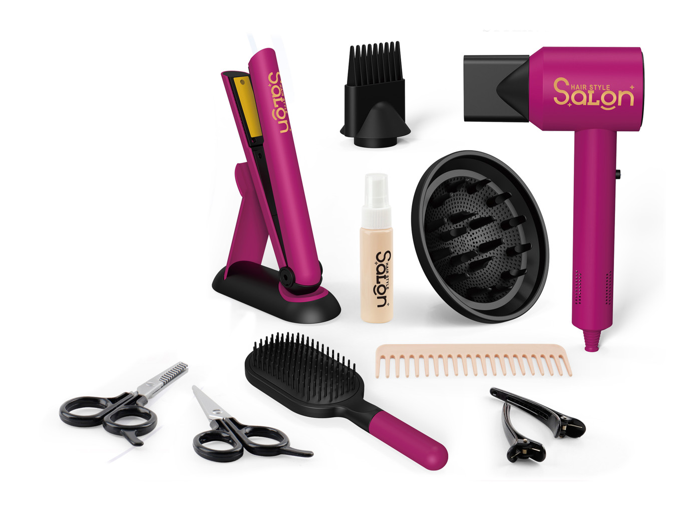 Dotaz na produktKosmetický set s fénem a žehličkou set. Baterie do fénu 2xAA nejsou součástí, baterie do žehličky 2xAAA nejsou součástí. Obsahuje fén, žehličku, kartáč, hřeben, 2x nůžky, 2x sponky, sprej, nástavce.