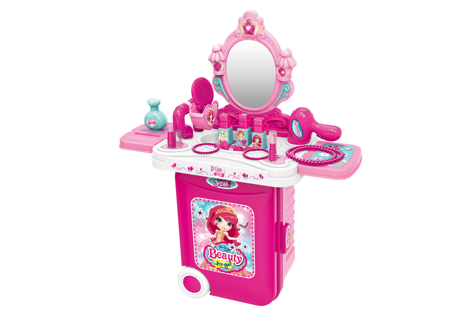 Dotaz na produktKosmetický stolek kufřík. Velikost 38cm . Kufřík je na kolečkách a má vysunovací madlo. Výška s vysunutým madlem 55,5cm, výška se zasunutým madlem 38cm. Kufřík jde přestavět na kosmetický stolek o rozměrech: 60x50x21cm. Návod na sestavení na obale. Obsahuje fén, kartáč na vlasy, náramky a další příslušenství. Baterie 3xAAA nejsou součástí. Zezadu zrcadla je vypínač na jeho rozsvícení. světelné a zvukové efekty