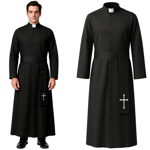 Dotaz na produktKlasický kněžský oděv s černou sutanou s límcem a zavěšeným křížem je Kostým připravený k nošení, ideální na Halloween, kostýmní večírky a divadelní představení. Volný střih a velikosti XL/XXL zajišťují pohodlné nošení. Styling je poutavý a dodá každé události charakter.