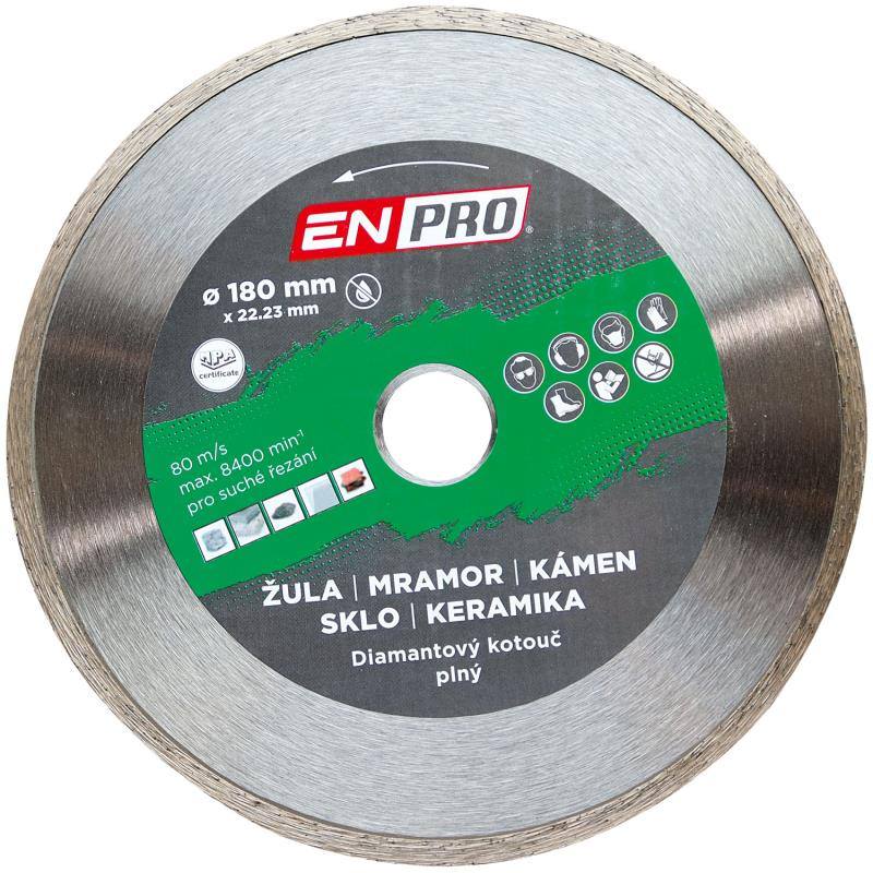 • Diamantové kotouče prémiové značky ENPRO, která je zárukou profesionální kvality. ENPRO kotouče vynikají především vysokou kvalitou použitého materiálu a dlouhodobou životností. Certifikace MPA. Celoobvodové kotouče se využívají na tvrdé materiály, které se snadno štěpí jako: beton, žula, sklo a keramika. Charakteristickým rysem je hladký řez bez odštěpků. Kotouč je uzpůsoben na řezání za mokra, ale zvládne i suchý řez.