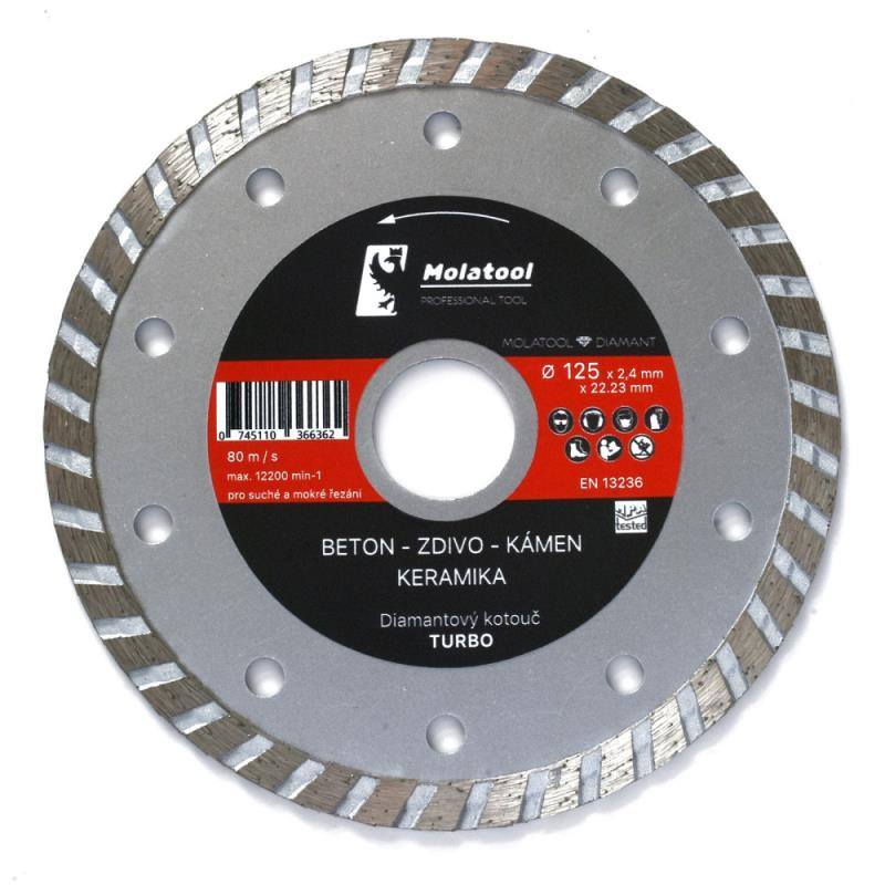 kotouč diamantový řezný Molatool Turbo Profiprofesionální univerzální řezný kotouč pro řezání s ručními úhlovými bruskami s velmi dobrým chlazením než celoobvodové diamantové kotoučenástroj je vhodný...