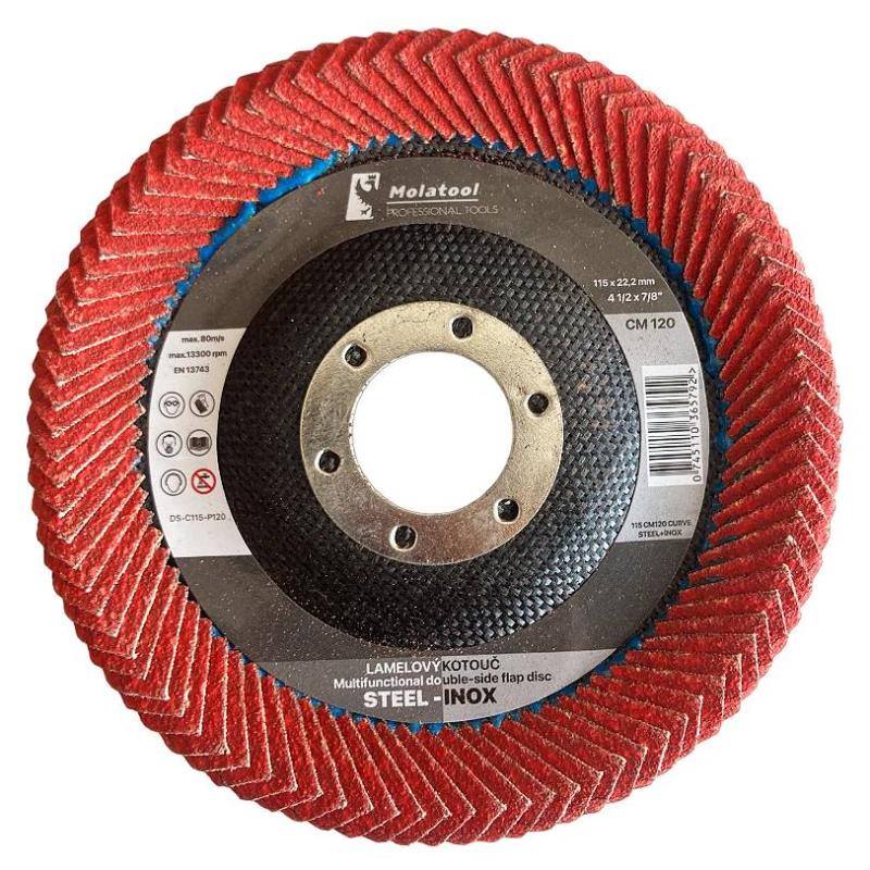 • brusný kotouč se špičkovým samoostřícím keramickým brusivem, kde lamely jsou na všech pracovních plochách (spodní, čelní a horní) kotouče a tvarově jsou přizpůsobeny pro broušení standardně i obtížně dostupných svarových ploch jakýchkoliv svarků jakož i všech typů obrobitelných materiálů, běžné oceli a ocele vyšších pevností, legovaná ocel, nerezovaných ocelí, tvrdých materiálů, svařovacích materiálů atd.