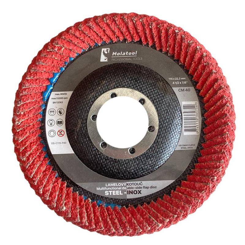 • brusný kotouč se špičkovým samoostřícím keramickým brusivem, kde lamely jsou na všech pracovních plochách (spodní, čelní a horní) kotouče a tvarově jsou přizpůsobeny pro broušení standardně i obtížně dostupných svarových ploch jakýchkoliv svarků jakož i všech typů obrobitelných materiálů, běžné oceli a ocele vyšších pevností, legovaná ocel, nerezovaných ocelí, tvrdých materiálů, svařovacích materiálů atd.
