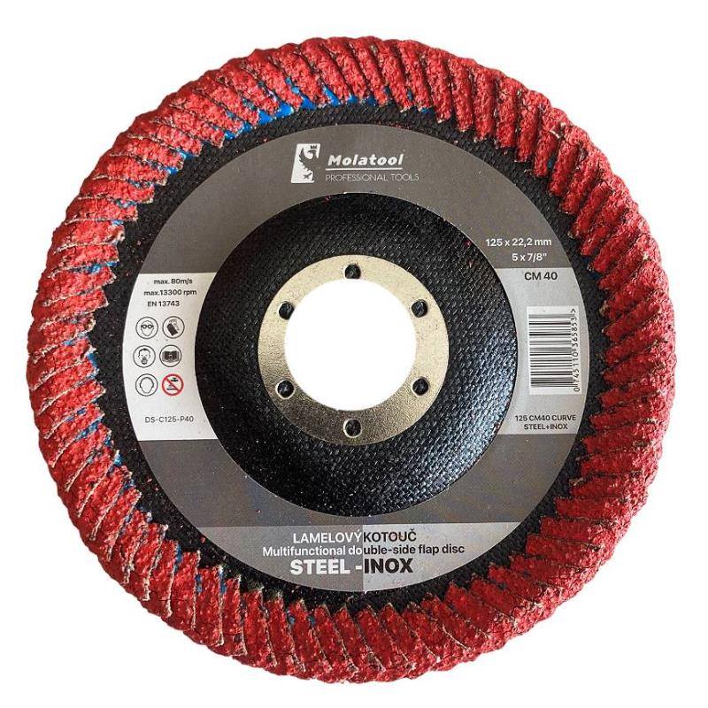 • brusný kotouč se špičkovým samoostřícím keramickým brusivem, kde lamely jsou na všech pracovních plochách (spodní, čelní a horní) kotouče a tvarově jsou přizpůsobeny pro broušení standardně i obtížně dostupných svarových ploch jakýchkoliv svarků jakož i všech typů obrobitelných materiálů, běžné oceli a ocele vyšších pevností, legovaná ocel, nerezovaných ocelí, tvrdých materiálů, svařovacích materiálů atd.