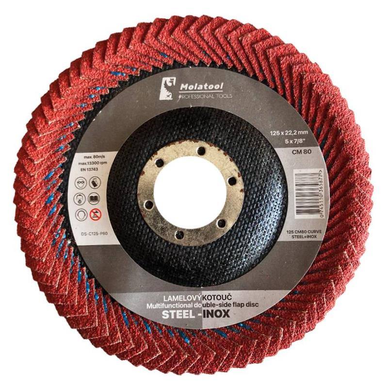 • brusný kotouč se špičkovým samoostřícím keramickým brusivem, kde lamely jsou na všech pracovních plochách (spodní, čelní a horní) kotouče a tvarově jsou přizpůsobeny pro broušení standardně i obtížně dostupných svarových ploch jakýchkoliv svarků jakož i všech typů obrobitelných materiálů, běžné oceli a ocele vyšších pevností, legovaná ocel, nerezovaných ocelí, tvrdých materiálů, svařovacích materiálů atd.