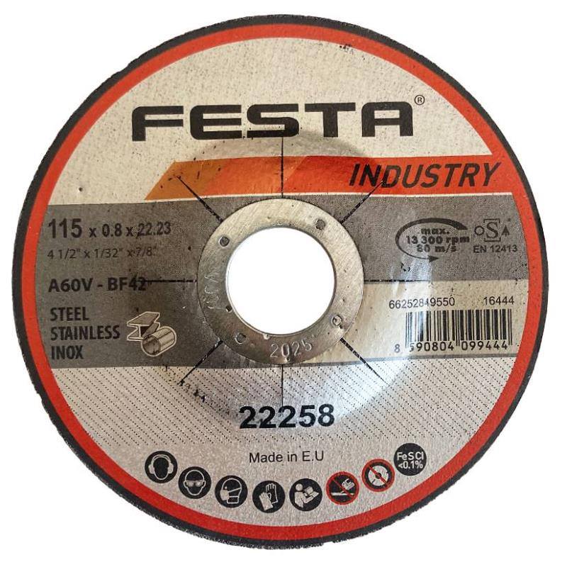 ÚvodNářadíElektrické nářadíElektrické bruskyKotoučeKotouč řezný kov Ø 115 x 0,8 x 22,2 mm, FESTA INDUSTRY