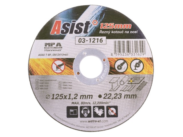 ** Základní vlastnosti řezného kotouče ASIST *** Rozměr: 125 x 22,23 x 1,2mm* Max. otáčky: 80 m/s* Max rpm. 12200 min-1* Tvar T41