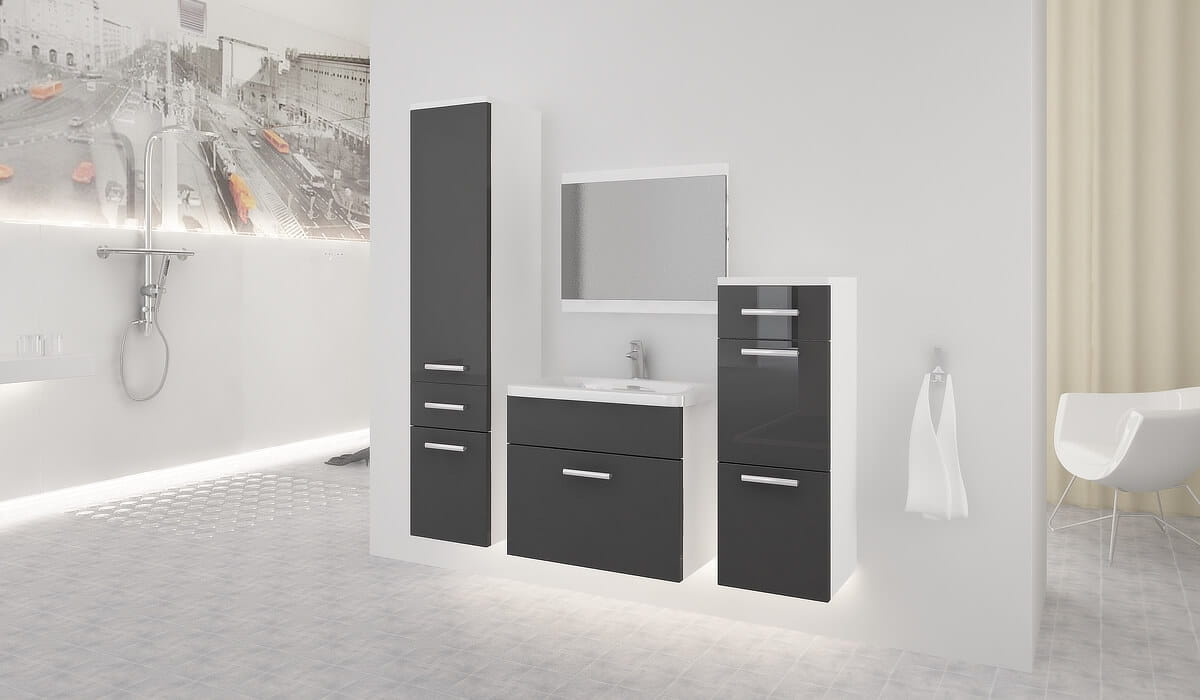 Dotaz na produkt Na splátky ještě dnesModerní a jednoduchá koupelnová sestava, která splní svůj praktický i dekorativní účel. Sestava se skládá ze dvou závěsných skříněk, zrcadla a skříňky pod umyvadlo včetně umyvadla. Koupelnová sestava má plastové úchyty v šedé barvě. Dvířka jsou vyrobena v lesku z lamina tloušťky 16 mm v bílé barvě, korpusy jsou v bílém provedení MAT tloušťky lamina 18 mm.. Zboží je dodáváno v demontu se schematickým návodem k montáži. Vyobrazené dekorace nejsou v ceně sestavy. Sestavu nabízíme také v dalších barevných provedeních, které jsou k vidění na vedlejších fotografiích.