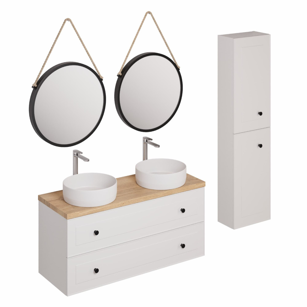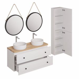 Koupelnová sestava s umyvadlem včetně umyvadlové baterie, vtoku a sifonu Naturel Forli je cenově zvýhodněný koupelnový set, který nabízí moderní a jednoduchý design. Skříňky jsou vyrobeny z kvalitního materiálu v bílé barvě, která dodává celé sestavě elegantní vzhled. Sestava nabízí dostatek úložného prostoru pro koupelnové potřeby. Umyvadlová baterie s chromovaným povrchem dokonale ladí s designem sestavy. Celkově se jedná o moderní a stylovou sestavu, která dokonale doplní vaši koupelnu.