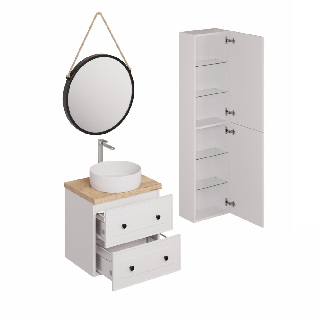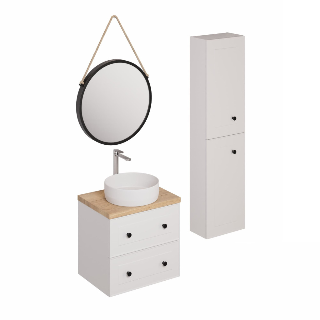 Koupelnová sestava s umyvadlem včetně umyvadlové baterie, vtoku a sifonu Naturel Forli je cenově zvýhodněný koupelnový set, který nabízí moderní a jednoduchý design. Skříňky jsou vyrobeny z kvalitního materiálu v bílé barvě, která dodává celé sestavě elegantní vzhled. Sestava nabízí dostatek úložného prostoru pro koupelnové potřeby. Umyvadlová baterie s chromovaným povrchem dokonale ladí s designem sestavy. Celkově se jedná o moderní a stylovou sestavu, která dokonale doplní vaši koupelnu.