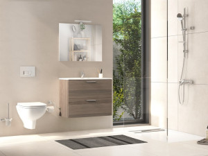 Součástí dodávky není vysoká skříňka, kterou můžete vidět na některých obrázcích v galerii. Můžete si ji ale pořídit pro rozšíření úložného prostoru v koupelně. Skříňka ve stejné barvě je doporučena v příslušenství.
