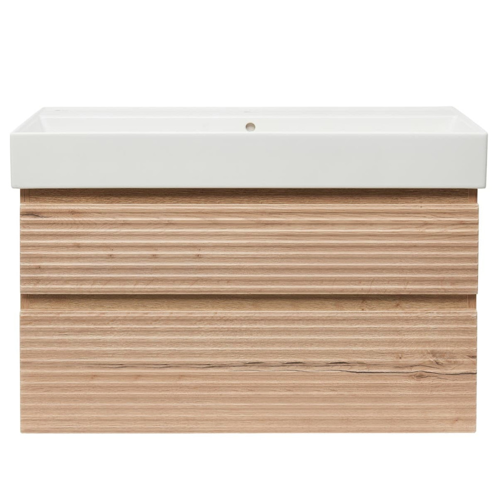 Koupelnová skříňka s keramickým umyvadlem patří do série Naturel Savona. Tato série je vyjímečná frézováním, které dodává celkovému vzhledu skříňky nadčasový charakter a zároveň ji činí moderní a stylovou. Tento prvek se také postará o to, že koupelnová skříňka bude vypadat jedinečně a nezaměnitelně. Součástí skříňky je keramické umyvadlo, které perfektně ladí s celkovým vzhledem. Koupelnová skříňka v dekoru dub halifax nabízí dostatek úložného prostoru pro vaše koupelnové potřeby.