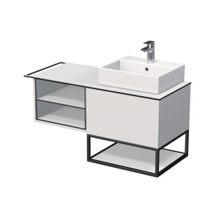 Skříňka je dodávaná ve třech samostatných dílech - skříňka pro umyvadlo s dvěma zásuvkami (smontované), krycí deska s držákem pro ručník vpravo a ALU police v černém laku. Součástí dodávky je potřebný počet konzolí pro uchycení krycí desky.