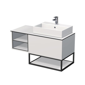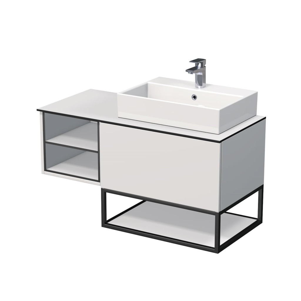Skříňka je dodávaná ve třech samostatných dílech - skříňka pro umyvadlo s dvěma zásuvkami (smontované), krycí deska s držákem pro ručník vpravo a ALU police v černém laku. Součástí dodávky je potřebný počet konzolí pro uchycení krycí desky.