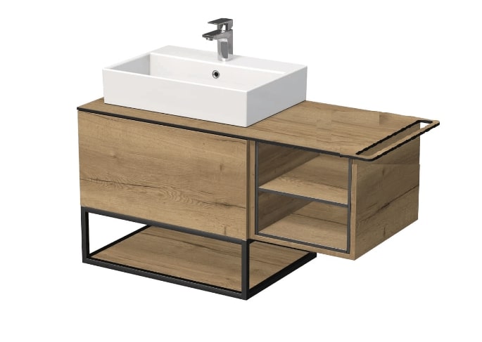 Skříňka je dodávaná ve třech samostatných dílech - skříňka pro umyvadlo s dvěma zásuvkami (smontované), krycí deska s držákem pro ručník vpravo a ALU police v černém laku. Součástí dodávky je potřebný počet konzolí pro uchycení krycí desky.