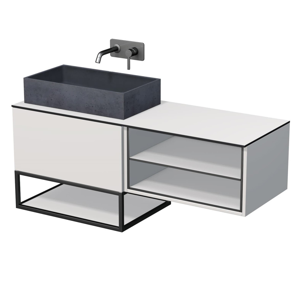 Skříňka je dodávaná ve třech samostatných dílech - skříňka pro umyvadlo s dvěma zásuvkami (smontované), krycí deska s držákem pro ručník vpravo a ALU police v černém laku. Součástí dodávky je potřebný počet konzolí pro uchycení krycí desky.