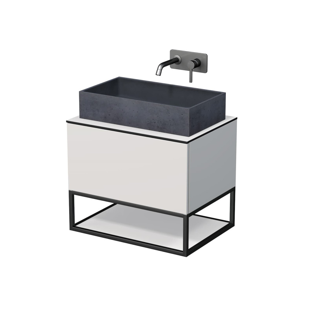 Skříňka je dodávaná ve třech samostatných dílech - skříňka pro umyvadlo s dvěma zásuvkami (smontované), krycí deska s držákem pro ručník vpravo a ALU police v černém laku. Součástí dodávky je potřebný počet konzolí pro uchycení krycí desky.