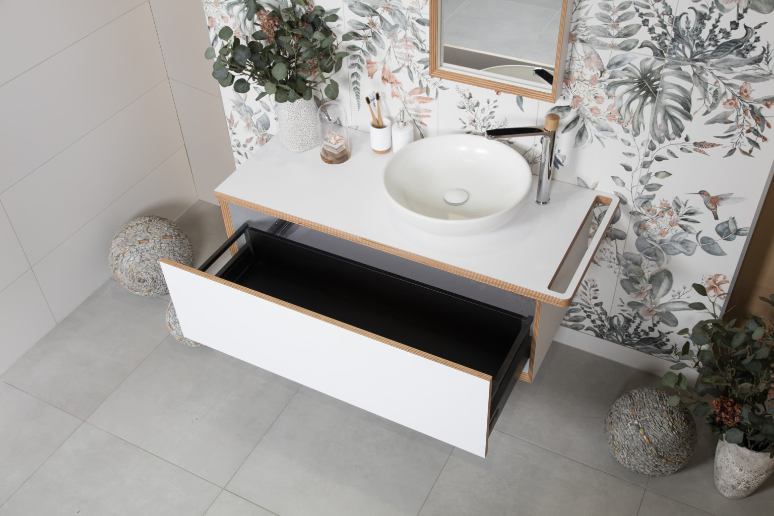 Dotaz na produkt Na splátky ještě dnesSkříňka v bílé matné barvě v kombinaci s přiznanými celobukovými hranami Multiplex. Tyto hrany jsou ošetřené olejem. Jedná se o celobukové překližky složené z mnoha vrstev dýh, které jsou spojené lepidlem. Tento materiál vyniká svou odolností vůči vodě, takže je ideální pro použití v koupelně. Multiplex je navíc odolný vůči poškrábání a je ošetřen speciální úpravou proti otiskům prstů. Váš nábytek tak vydrží ve vaší koupelně dlouhá léta jako nový.