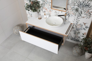 Dotaz na produkt Na splátky ještě dnesSkříňka v bílé matné barvě v kombinaci s přiznanými celobukovými hranami Multiplex. Tyto hrany jsou ošetřené olejem. Jedná se o celobukové překližky složené z mnoha vrstev dýh, které jsou spojené lepidlem. Tento materiál vyniká svou odolností vůči vodě, takže je ideální pro použití v koupelně. Váš nábytek tak vydrží ve vaší koupelně dlouhá léta jako nový.
