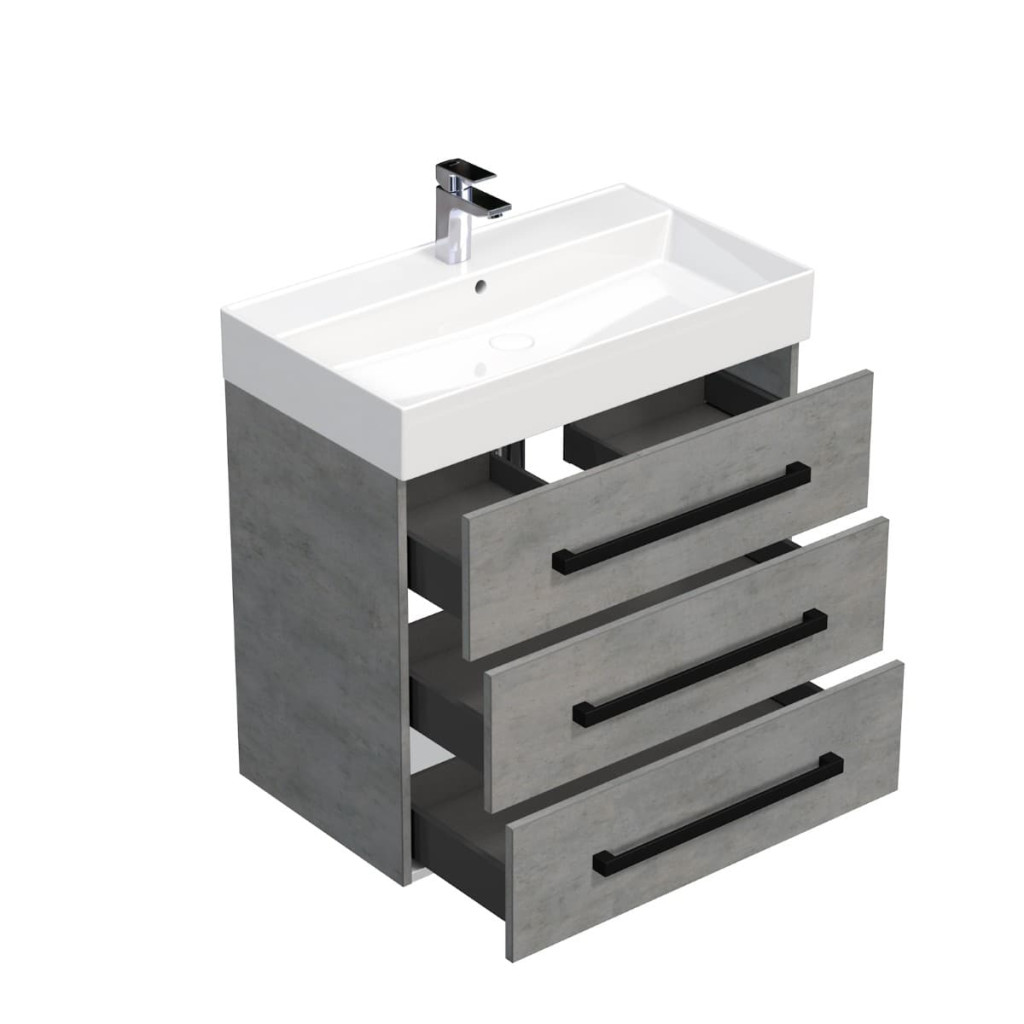 Dotaz na produkt Na splátky ještě dnesKoupelnová skříňka s umyvadlem SAT Cube Way nabízí potřebné úložné prostory pro vaši koupelnu a zároveň působí moderním a stylovým dojmem. Moderní keramické umyvadlo v kombinaci s čistými liniemi skříňky v imitaci betonu, vytváří dokonalý designový celek. Skříňka disponuje praktickými plnovýsuvnými zásuvkami s dotahem pro snadný přístup k vašim kosmetickým potřebám.