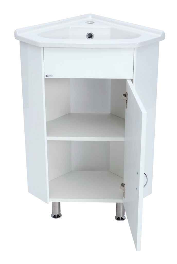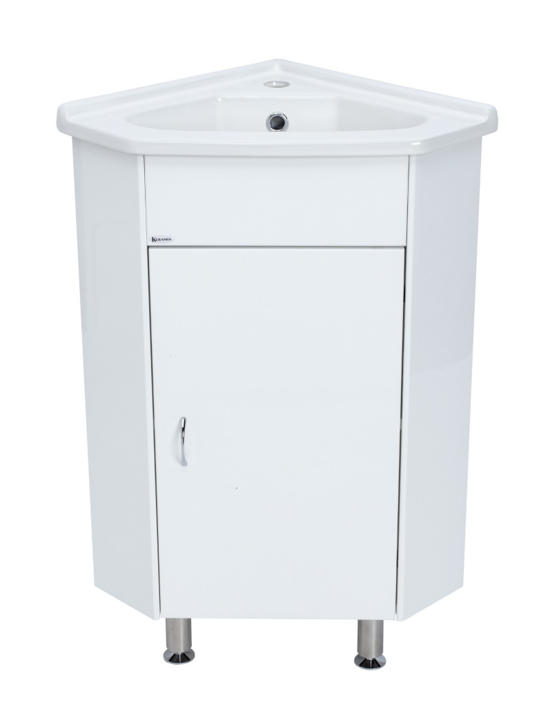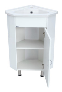 Dotaz na produkt Na splátky ještě dnesRohová umyvadlová skříňka v bílém lesklém laku. Součást balení jsou 3 kusy nožiček.