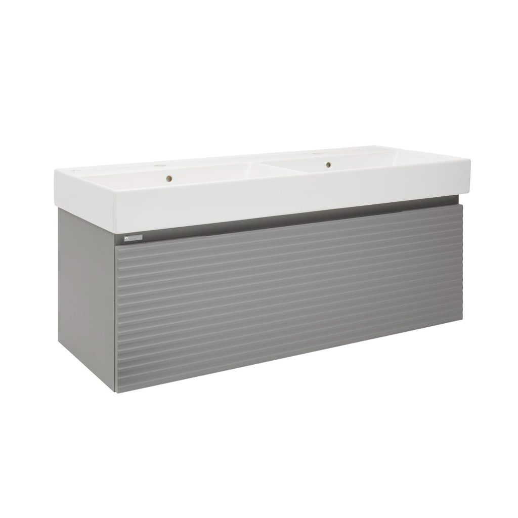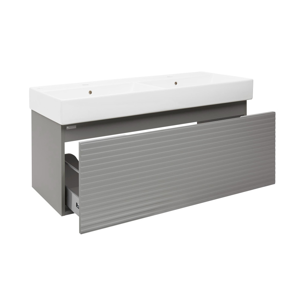 Dotaz na produkt Na splátky ještě dnesKoupelnová skříňka s keramickým umyvadlem patří do série Naturel Savona. Tato série je vyjímečná frézováním, které dodává celkovému vzhledu skříňky nadčasový charakter a zároveň ji činí moderní a stylovou. Tento prvek se také postará o to, že koupelnová skříňka bude vypadat jedinečně a nezaměnitelně. Součástí skříňky je keramické umyvadlo, které perfektně ladí s celkovým vzhledem. Koupelnová skříňka v šedé matné barvě nabízí dostatek úložného prostoru pro vaše koupelnové potřeby.