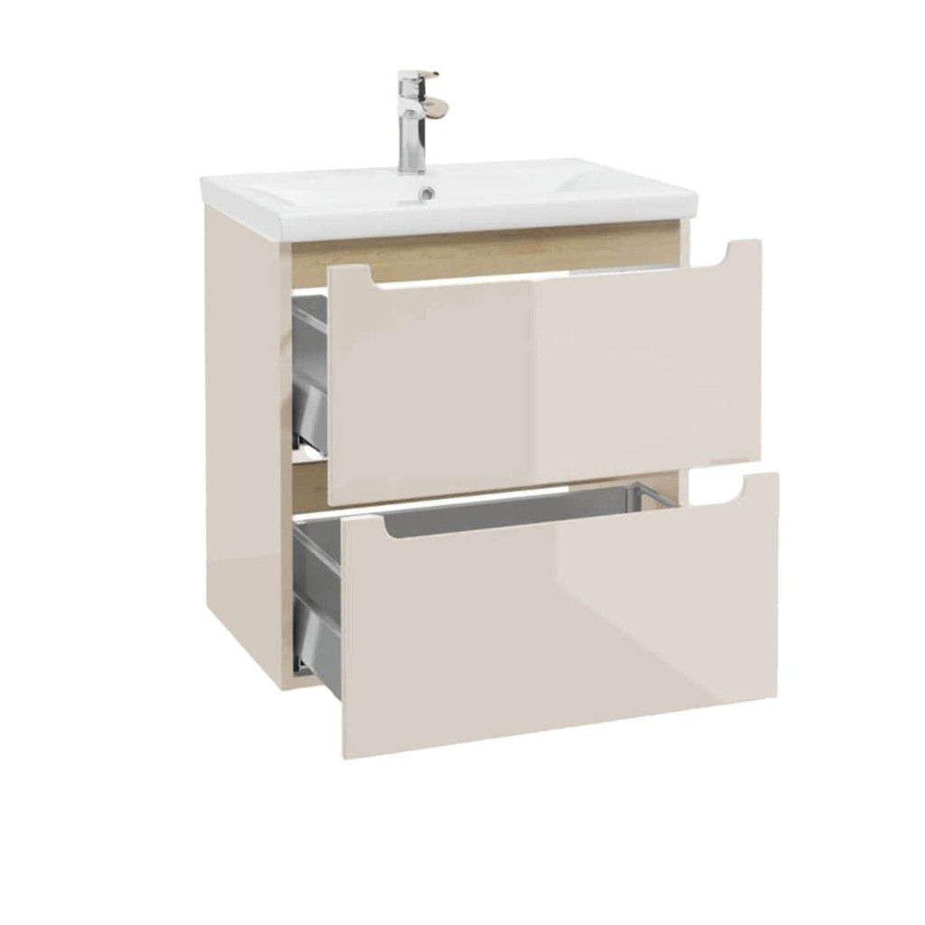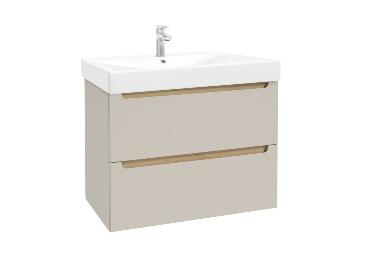 Dotaz na produkt Na splátky ještě dnesZávěsná koupelnová skříňka Stilla v kašmírové barvě se dvěma zásuvkami v rozměru 80x60x45 cm s elegantním umyvadlem Verso VERSO80. Skříňka je součástí modulární kolekce a lze ji kombinovat s přidáním dalších skříněk z kolekce a boxů. Toto řešení umožňuje získat více úložného prostoru pro všechny koupelnové doplňky.