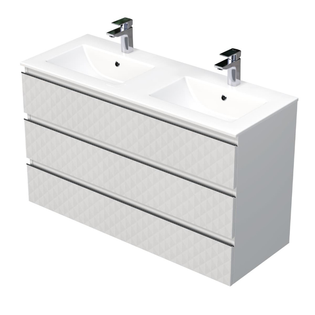 Dotaz na produkt Na splátky ještě dnesKoupelnová skříňka s umyvadlem SAT Cube Way s 3D pyramidovým dekorem. Tento dekor dodává skříňce elegantní a sofistikovaný vzhled, který zaujme na první pohled. Zásuvky jsou navíc vybaveny zafrézovanou černou úchytkou, což přidává na jejich praktičnosti a moderním designu. Bílé umyvadlo má jednoduchý, čistý design