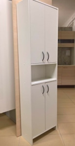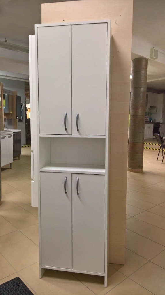 Dotaz na produkt Na splátky ještě dnesVysoká skříňka z bílého lamina, ideální ekonomická varianta do koupelny. Skříňka má 2 poličky, při instalaci se musí kotvit do zdi, aby se nepřevrátila při otevření. Dodáváno v rozloženém stavu (demont).