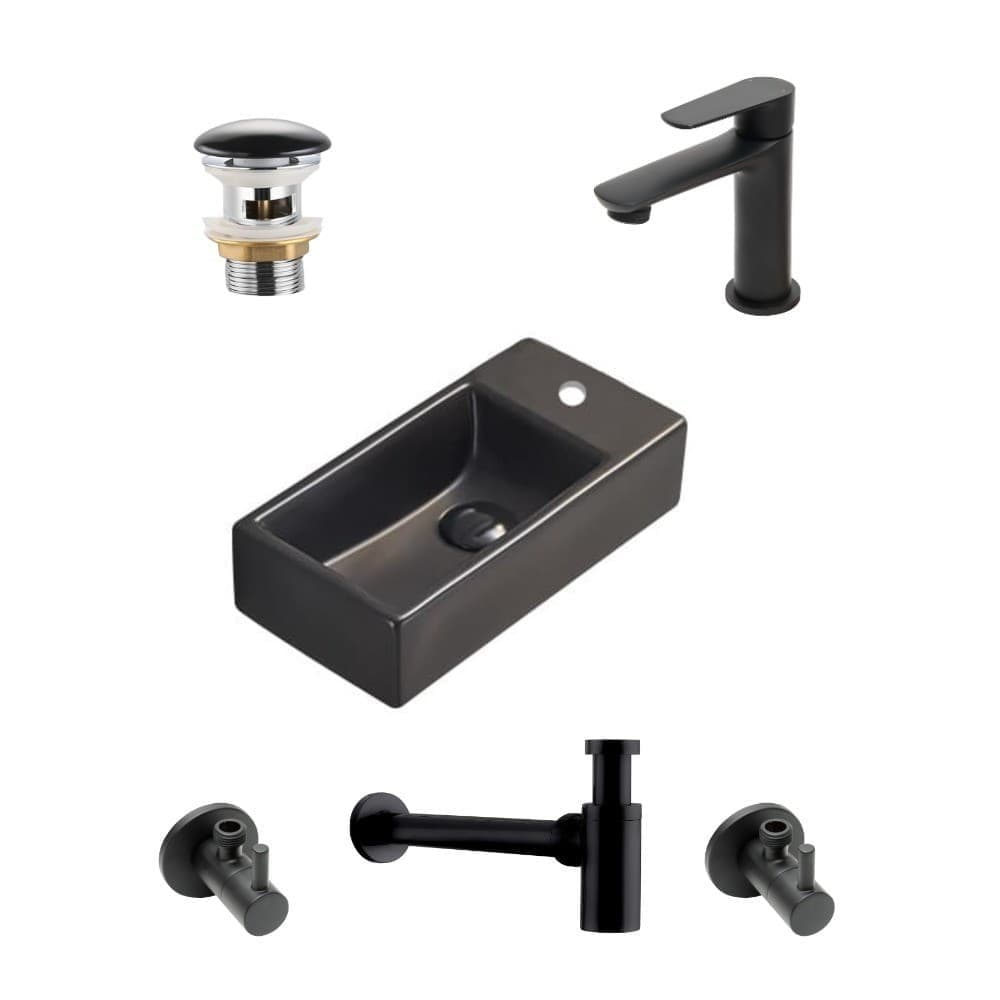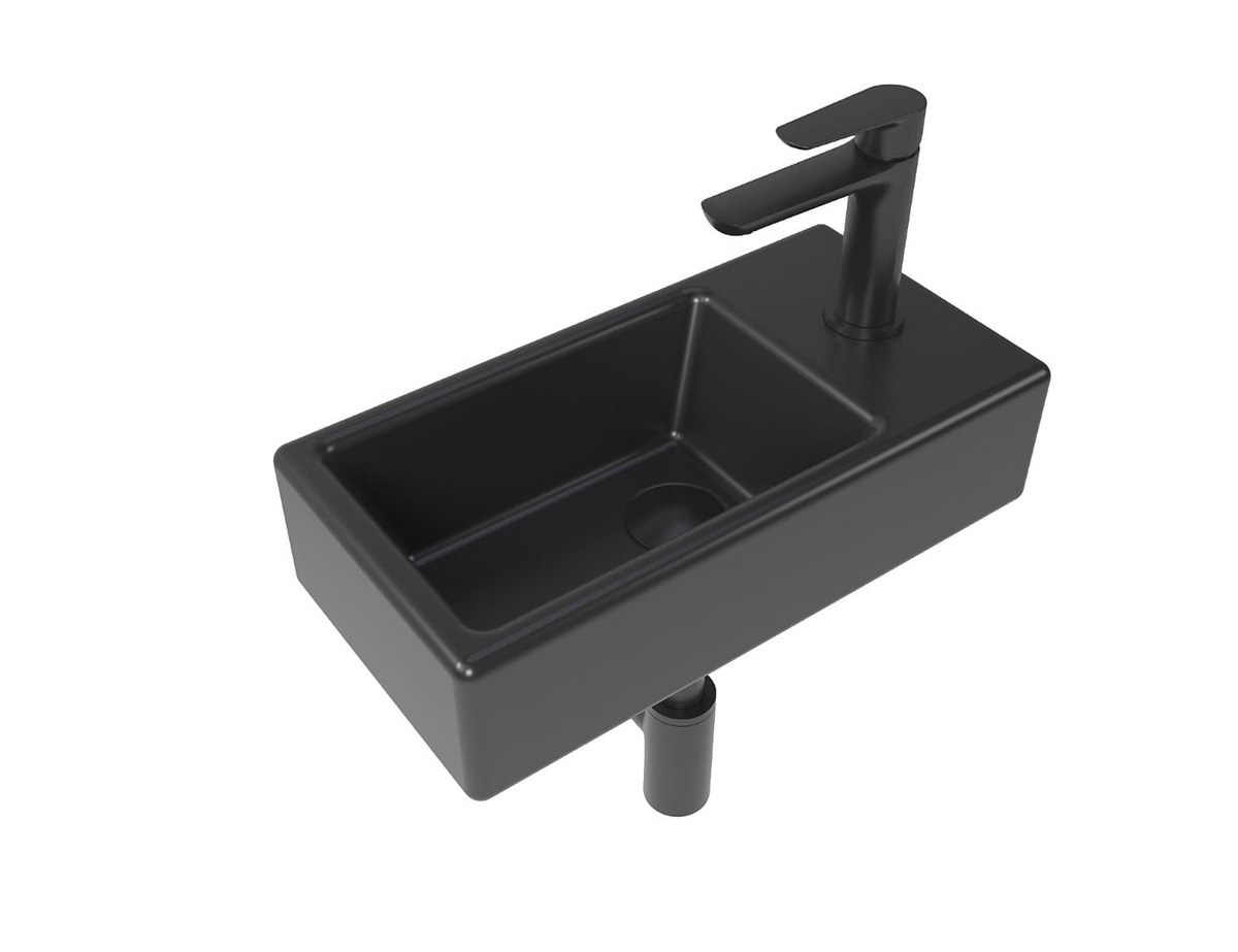 Koupelnový set pravého závěsného umývátka Brevis 40,5 cm, pákové baterie, sifonu, průtočné zátky a roháčků v černé barvě KSETBRE2PBKM