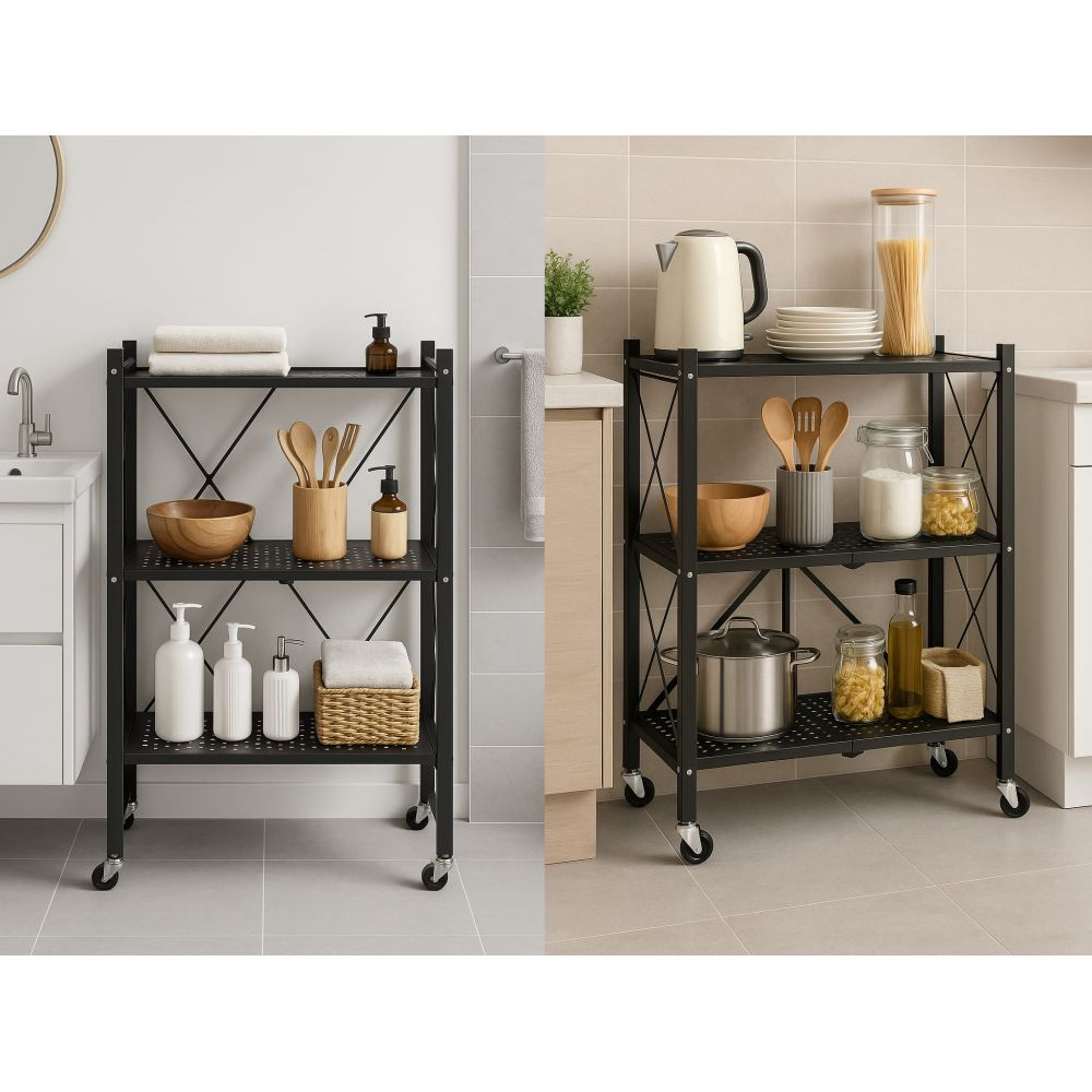 Praktický mobilní regál se stabilní kovovou konstrukcí a elegantním černým lakováním. Nabízí tři prostorné perforované police a nosnost 150 kg. Díky pantovému skládacímu systému je snadno skladovatelný a 360° kolečka s brzdami zajišťují skvělou mobilitu. Ideální do domácnosti, kanceláře, koupelny, garáže či skladu. Rozměry 70x35x87 kg, nosnost na polici 50 kg, celková nosnost 150 kg, hmotnost 7 kg.