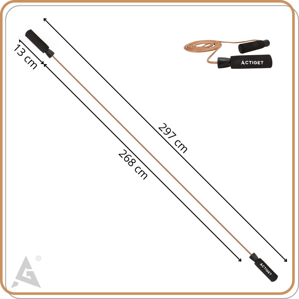 Švihadlo je vybaveno měkčenými protiskluzovými rukojeťmi, které zajišťují jistý a pohodlný úchop i při delším tréninku. Použitá odolná kožená šňůrka má dlouhou životnost a dobře drží tvar. Díky délce 297 cm je vhodné pro různé výšky postavy a snadno se přizpůsobí individuálním potřebám.