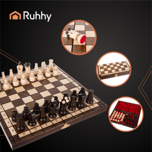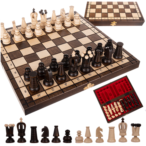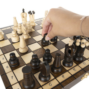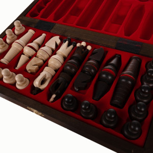 v sadě: šachovnice, která je zároveň pouzdrem, vložky, figurky a pěšci, pravidla hry ve 23 jazycích, balení