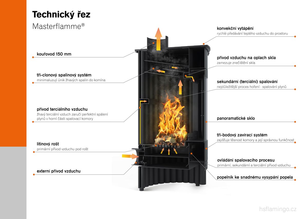 Krbová kamna MASTERFLAMME PICCOLO využívají přesně řízený přívod primárního, sekundárního a terciárního vzduchu, díky kterému dosahují: