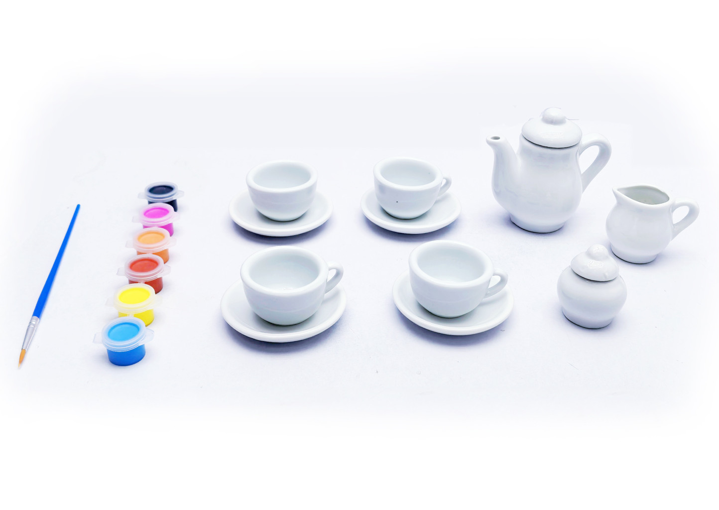 Dotaz na produktKreativní set malování čajové soupravy. Obsahuje 6 barev, štětec, 4 hrnečky s podšálky, konvičku, cukřenku. Velikost konvičky 8x8x4cm.